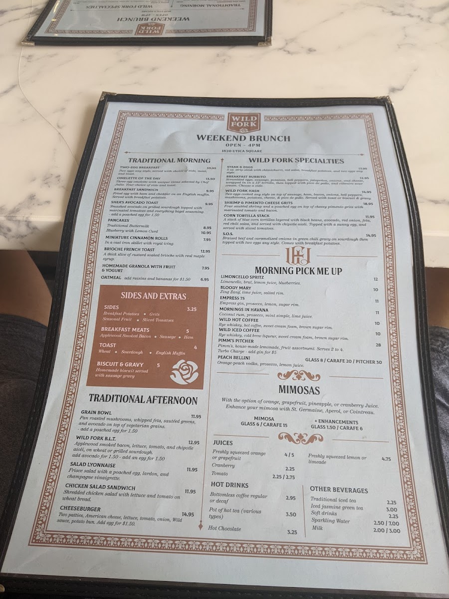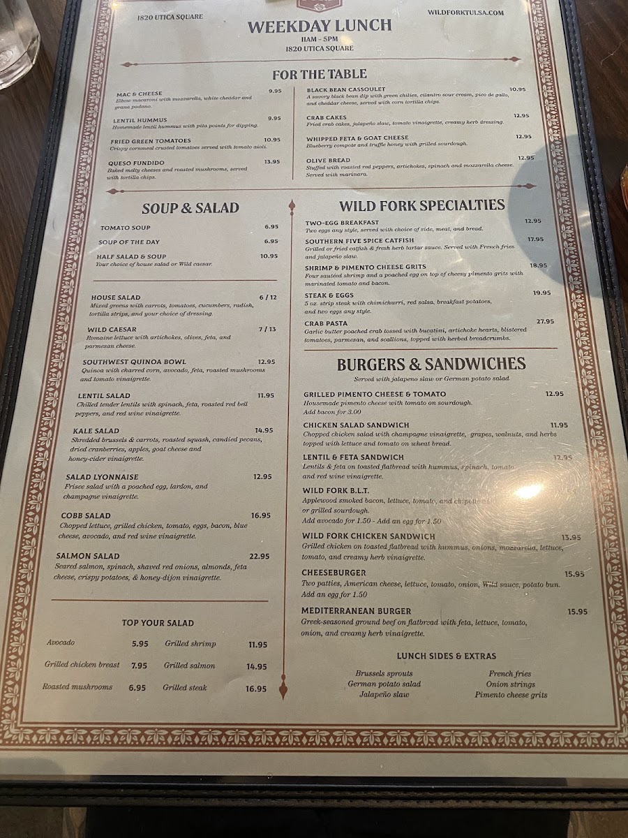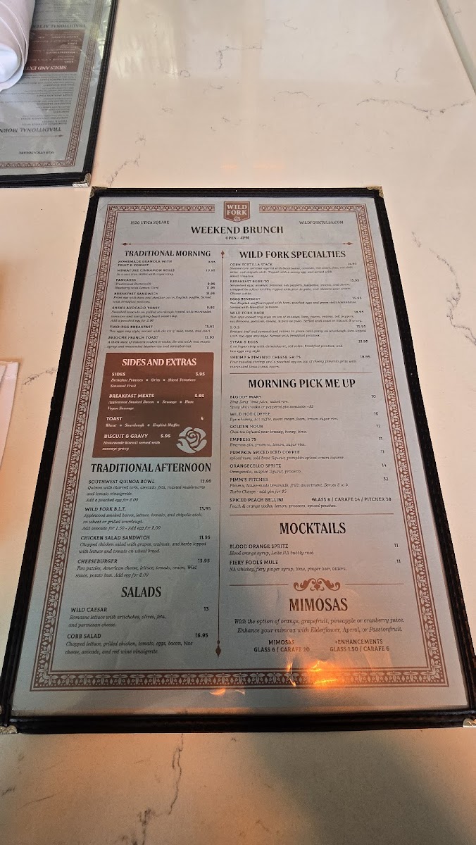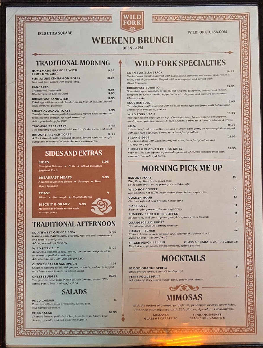 Wild Fork offers a thoughtfully curated menu that blends refined flavors with approachable, satisfying dishes. The selection ranges from comforting breakfast classics like Brioche French Toast to expertly prepared entrees such as Steak Diane and Grilled Salmon, creating a dining experience that can easily suit a leisurely brunch or an elegant dinner.