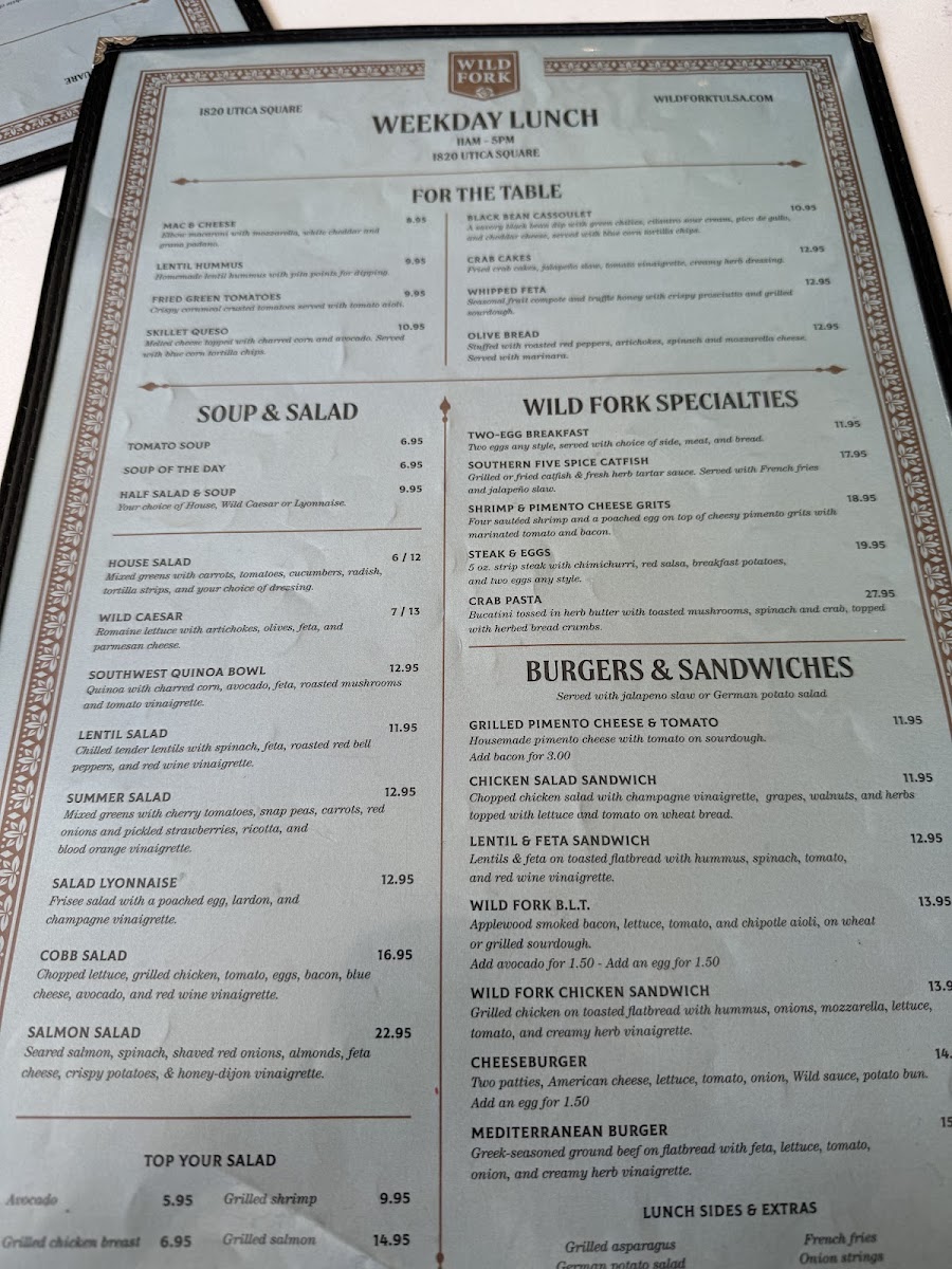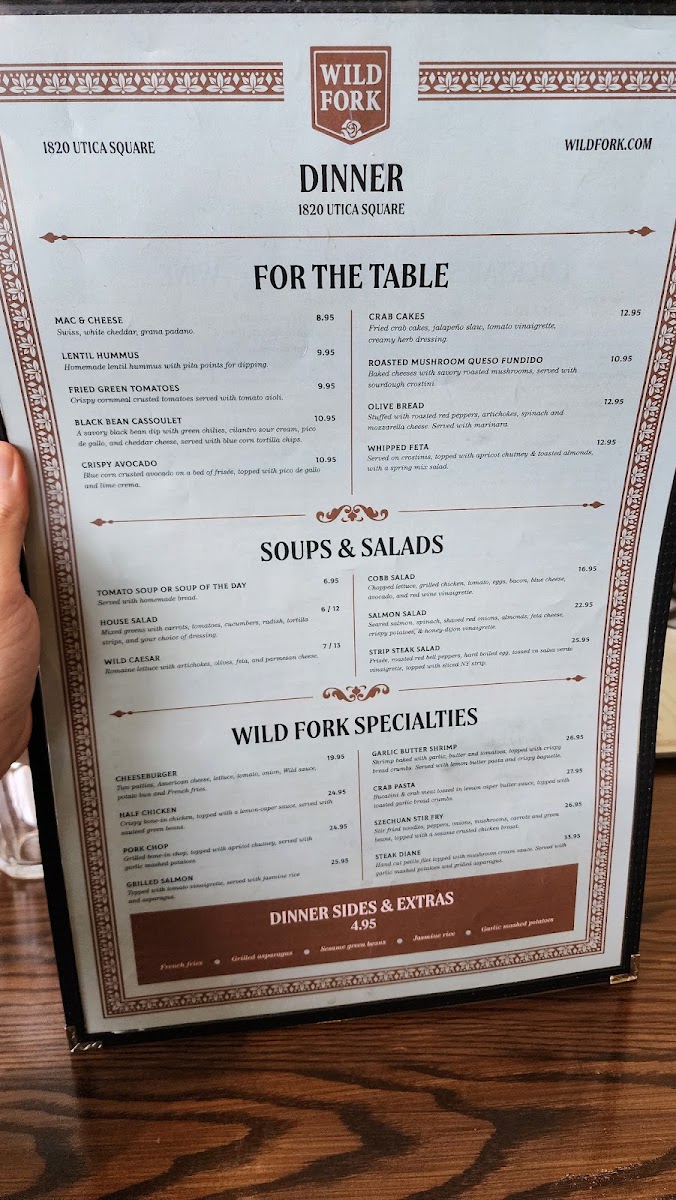 Guests can enjoy fresh, seasonal offerings alongside timeless favorites. Salads like the Cobb and Salmon Salad bring a light, fresh balance, while hearty options like the Wild Fork Chicken sandwich or the two-patty Cheeseburger provide a more casual, filling choice. The menu also embraces warm, homestyle touches with dishes like Fried Green Tomatoes, Garlic Mashed Potatoes, and German Potato Salad, making the overall experience feel welcoming and grounded.